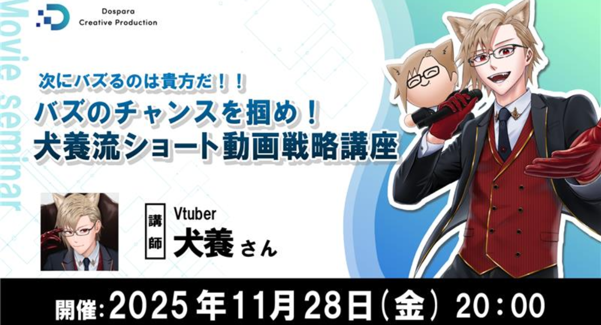 ドスパラは、人気Vtuber犬養氏を講師に迎え、『バズのチャンスを掴め!犬養流ショート動画戦略講座』を2025年11月28日(金)20時よりオンラインで開催します。現在、参加者を募集しています。