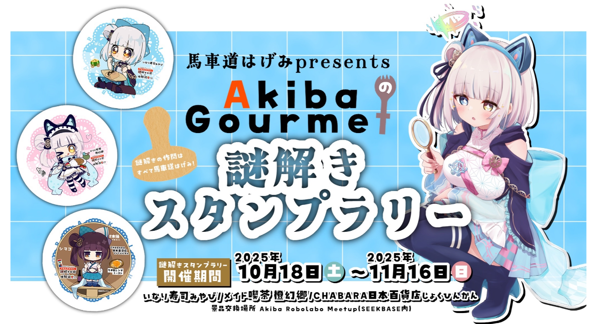 人気VTuber・馬車道はげみさんがプロデュースするリアルツアー・スタンプ&謎解きラリーイベントが2025年10月18日(土)から11月16日(日)の30日間開催!秋葉原のスタンプ設置店舗でスタンプをコンプリートし、謎解きを全問正解した方には先着でオリジナルポストカードプレゼントなどの特典が受けられるほか、スタンプ設置店舗での1,000円以上のお買物でも先着でオリジナルコースターをプレゼント!さらに、期間初日・2日目となる10月18日(土)・19日(日)には、馬車道はげみさん自らがガイド役としてコースをたどる「アキバVちゅあー」リアルツアーも開催します!