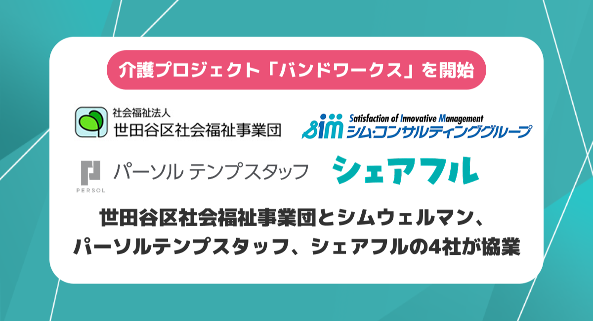 『世田谷区社会福祉事業団』と『シムウェルマン』、『パーソルテンプスタッフ』、『シェアフル』の4社が連携し、要介護者を抱える方々を支援する新プロジェクト「バンドワークス」※1を開始いたしました。本取り組みは、業界初の新たな支援モデルとして、介護負担と就労の両立を可能にする仕組みを提供します。※1 「バンドワークス」とは、介護者がスキマ時間を活用して短時間就業(バンドワーク)を行う間に介護保険制度につながっていない要介護者を預かる仕組みのこと