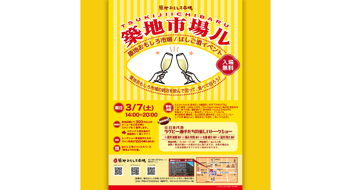 築地おもしろ市場(築地KYビル)の飲食店が1つのバルになる「築地市場ル」(つきじいちばる)を開催します!